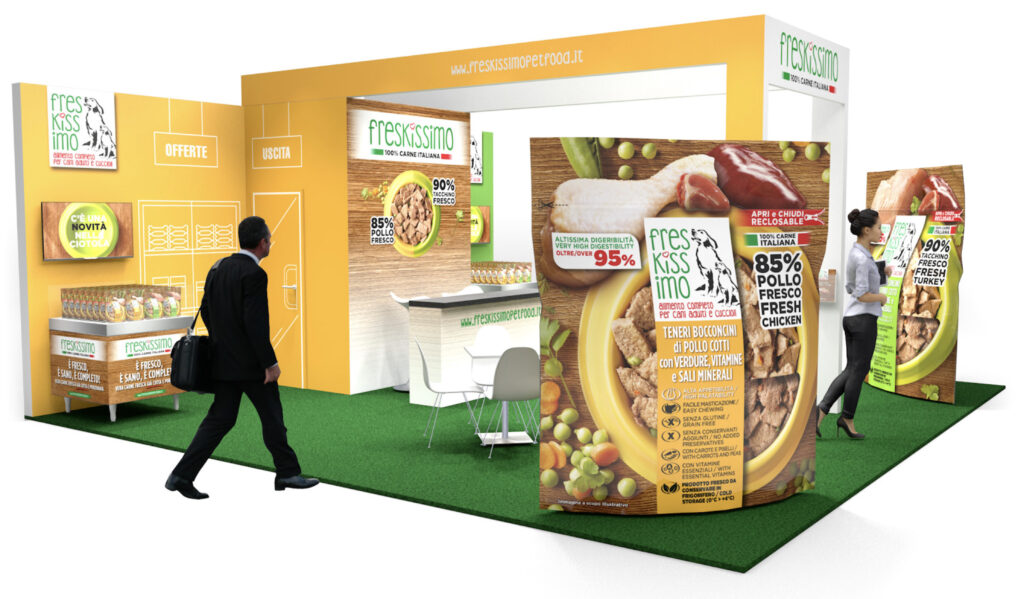 Studio per la realizzazione di uno Stand per Fiera di settore, utilizzando materiali esistenti come i frighi e video precedentemente realizzati, ed elementi nuovi riutilizzabili in altri eventi.
